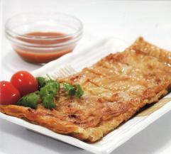 4 . 腐皮一块叠一块,把三块四方形腐皮叠至长方形卷。