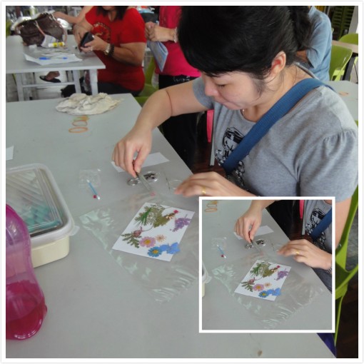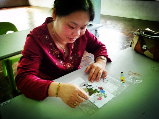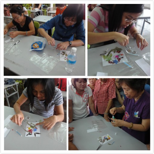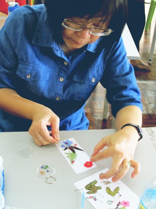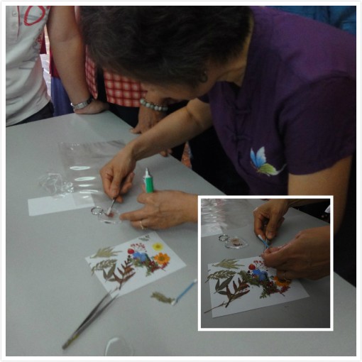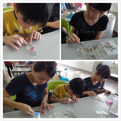 学员的锁匙圈作品 学员的书签及卡片制作。 学员的书签及卡片制作。 学员与余老师及妇女团团长合照