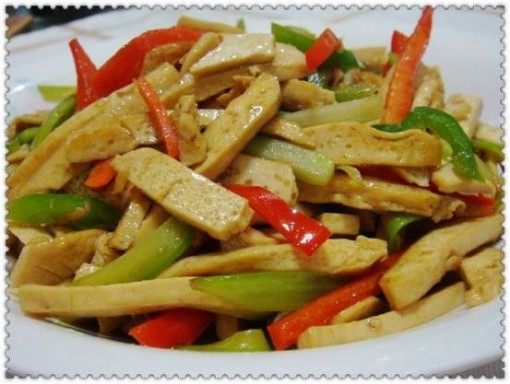 原料:白豆腐乾、紅尖椒、西芹、胡蘿蔔