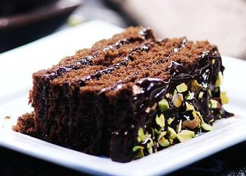 15、冷藏后的蛋糕用刀切掉四周不规则的部分,然后切成叁块。在蛋糕顶部涂上巧克力奶油,并撒一些碎果仁作为装饰。